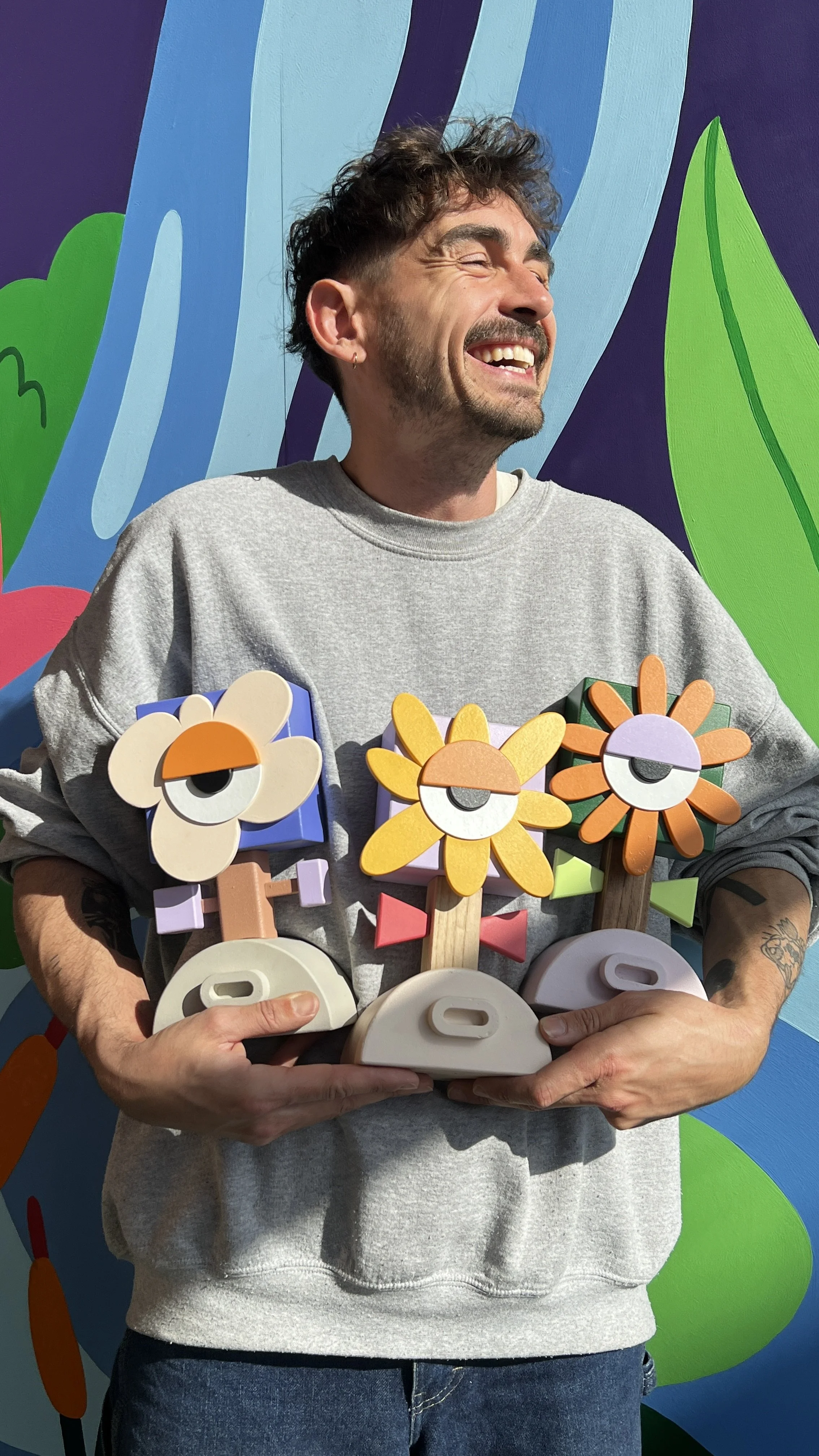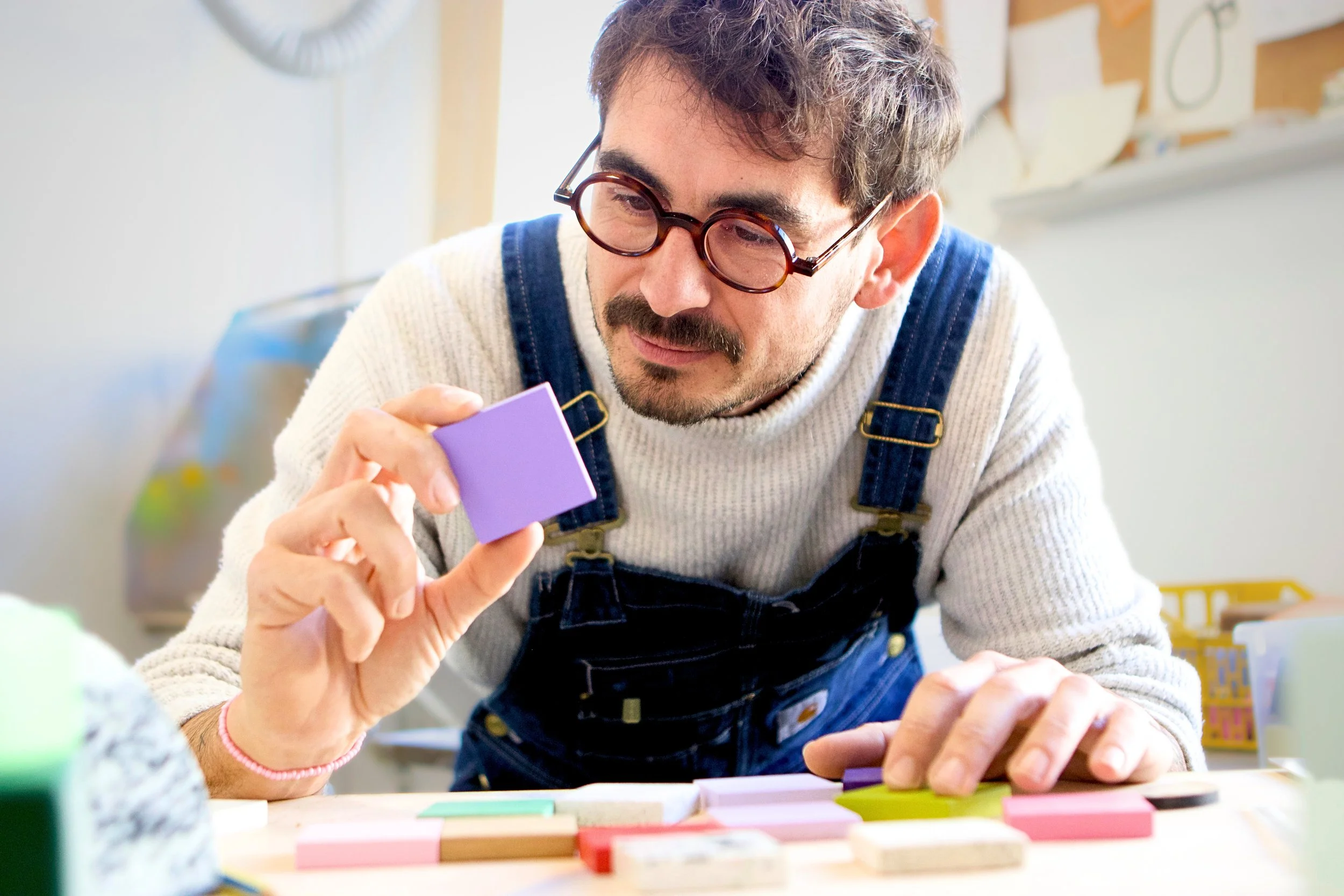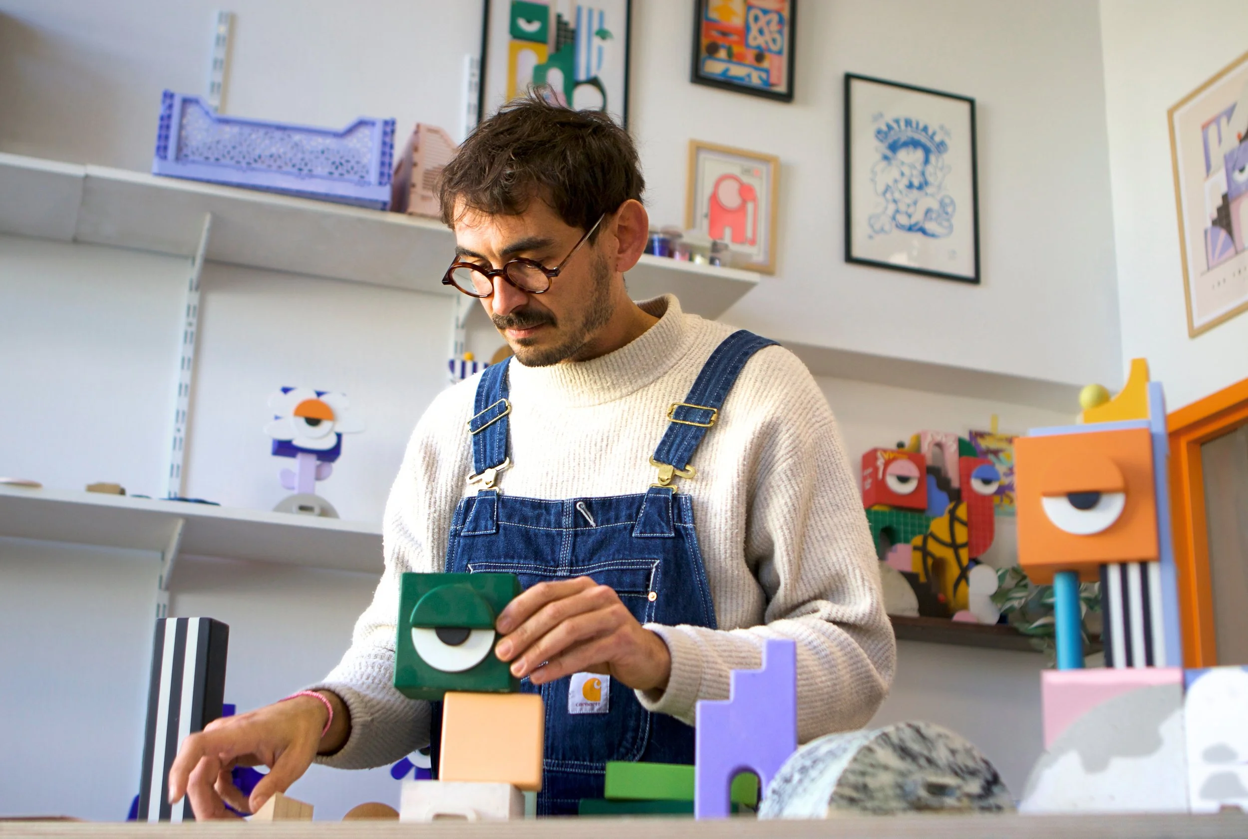 Hey, moi c’est Guillaume, créateur des TÊTES DURES. Mon approche combine mes racines dans le design graphique et produit avec le monde de l’art pour créer des œuvres, objets et scénographies singulières. Je joue avec des matières revalorisées, des couleurs joyeuses et des formes simples, toujours avec l’humain au cœur de ma démarche.
